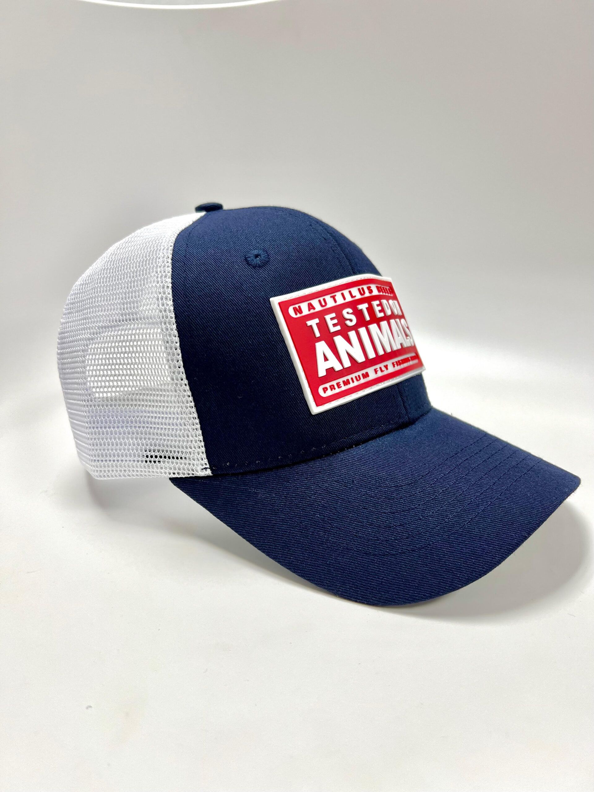 Rubber Tested on Animals patch on blue trucker with white mesh back.