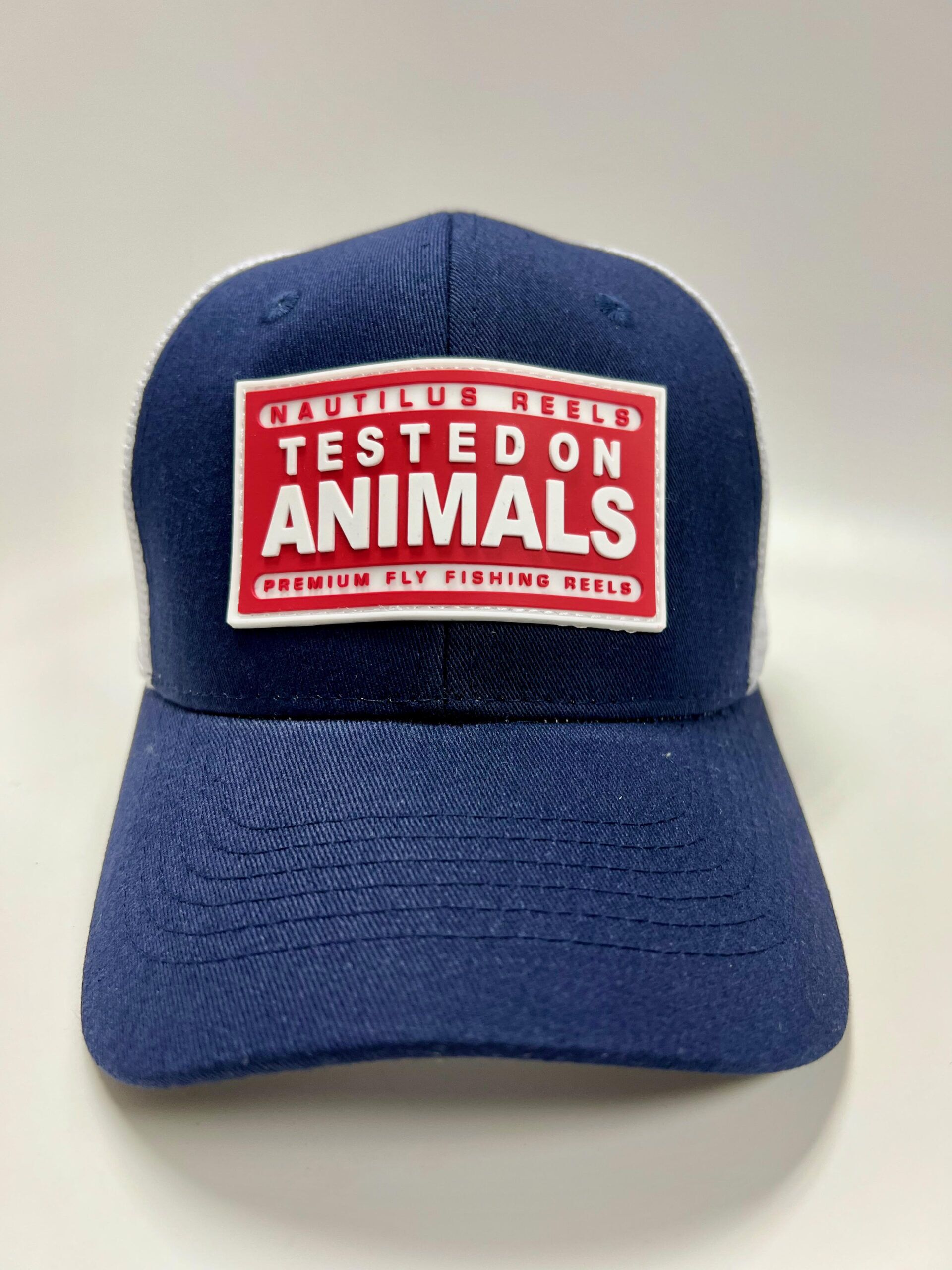 A classic improved. Rubber Tested on Animals patch on blue trucker with white mesh back. Even William can wear this.